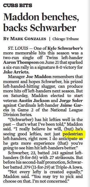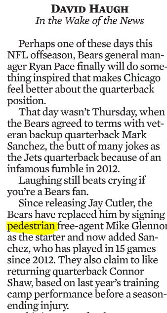 Another example of the marginalization of the word "pedestrian" comes from the recent December 19th issue of Sports Illustrated. In an article about Peyton Manning, Ben Reiter writes: "The last game Manning ever played was similarly pedestrian: 13 of 23 for 141 yards, no touchdowns, an interception and a lost fumble. That game though was Super Bowl 50."