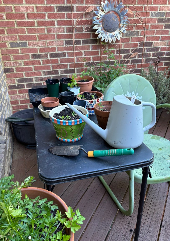 When my booth tables aren’t working at Destination Books’ popups they are being used as potting tables to transfer seedlings into pots.