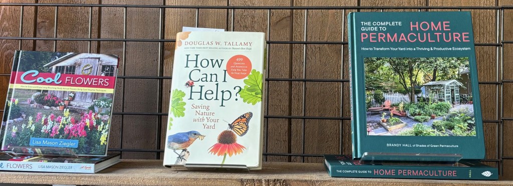 At the Journeyman a bike and coffee shop in downtown Decatur (with a hangout vibe), Destination Books maintains a subset of our inventory (~50 books). Currently on display are three books that can give you some fresh ideas of what you can do with your yard in 2026.
