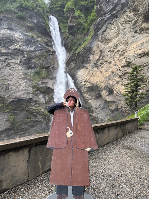 Before my arrival, I was aware that the small city of Meringen is a pilgrimage destination of Sherlock Holmes fame. Sir Arthur Conan Doyle himself vacationed in Meringen enough that he decided to end his Sherlock Holmes saga by having Holmes – locked into a death struggle with his arch enemy Dr. Morarity at Reichenbachfall, which looms just outside the town.
